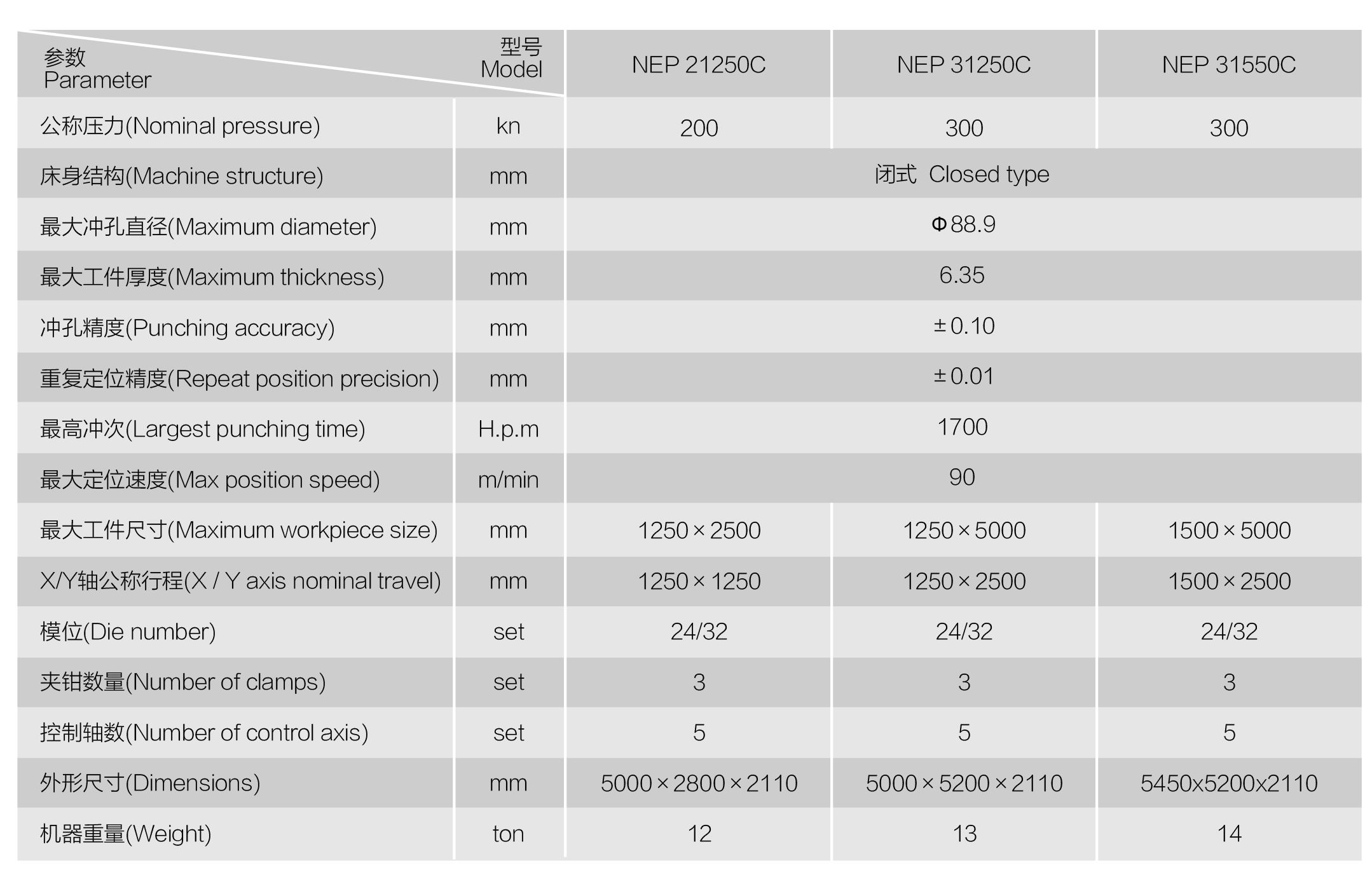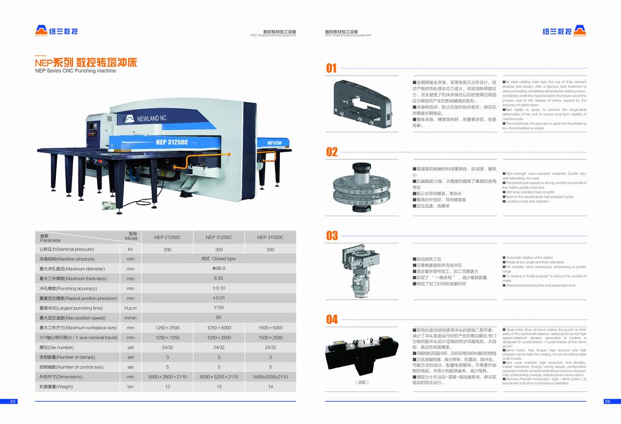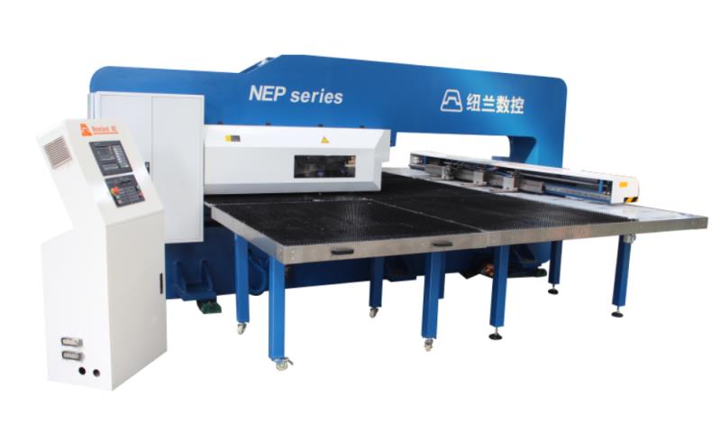 NEP系列全電伺服轉(zhuǎn)塔沖產(chǎn)品介紹 數(shù)控轉(zhuǎn)塔沖床是板材加工設(shè)備中最具生命力的產(chǎn)品,用于各類金屬薄板零件加工,可以一次性自動完成多種復(fù)雜孔型和淺拉深成型加工。通過自動編程,可對板材進行X,Y方向的精確定位,自動選擇轉(zhuǎn)盤模具庫中的模具,按程序加工不同尺寸和孔距的孔,也可用小沖模以步?jīng)_方式加工尺寸較大的各種形狀的曲線輪廓,也可進行特殊工藝加工,如百葉窗,淺拉伸,沉孔,翻邊孔,加強筋,壓印等。
